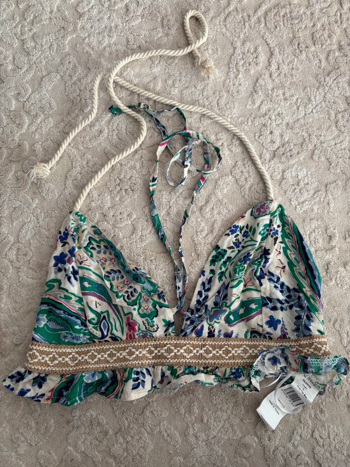 Bohem tarzda, askılı ve dantel detaylı bikini üstü. Hafif çok renkli batik desenli, mini ve vücuda oturan kesim. Plaj için uygun.