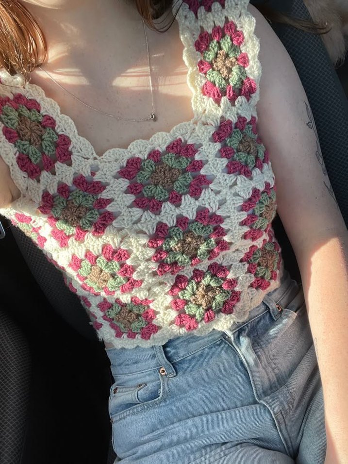 Bohem tarzı, V yaka ve kolsuz, bol kesim kadın yeleği. Örgü kumaştan, pastel tonlarda çok renkli tie-dye deseni ve dantel detaylarıyla midi boyda.