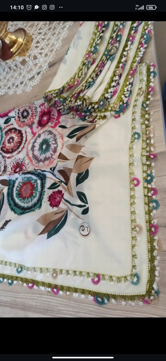 Bohem tarzda, çok renkli çiçek desenli ve ince dantel kenarlı kadın fuları. Hippie ve retro tarzlara uygun.