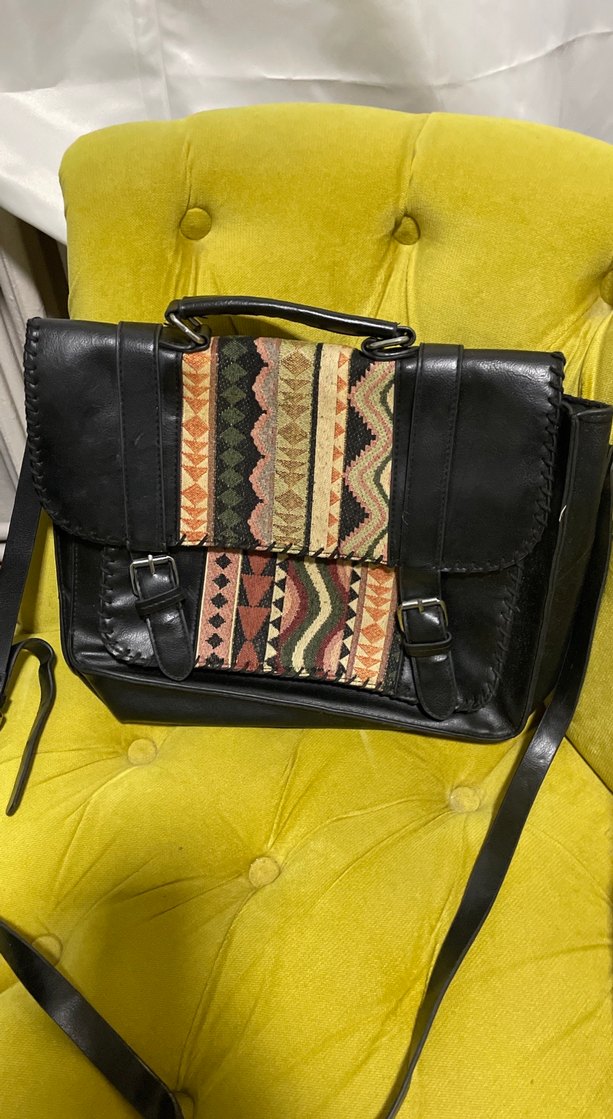 Bohem tarzda, çok renkli desenli ön panelli koyu deri kadın çantası. Tokalı kapak ve elde tutma sapı bulunur, günlük kullanıma uygun.
