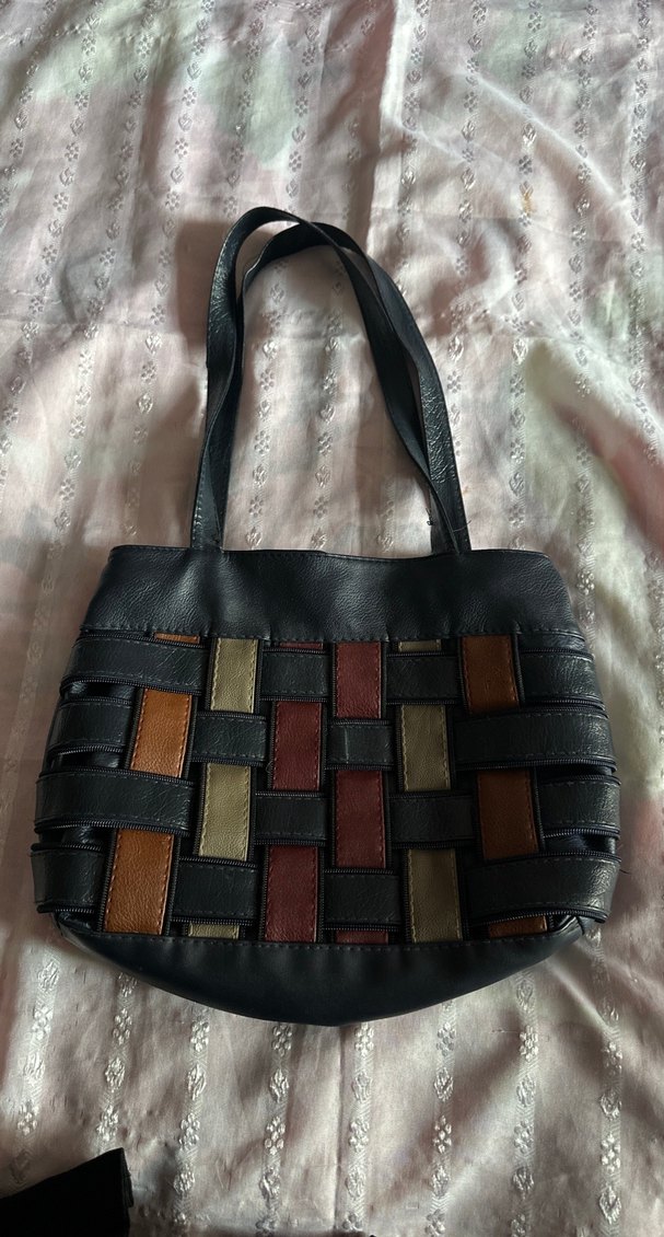 Bohem tarzı, çok renkli tokalı parçalarla koyu deri kadın çantası. Retro Paris havası ve günlük kullanım için uygun.