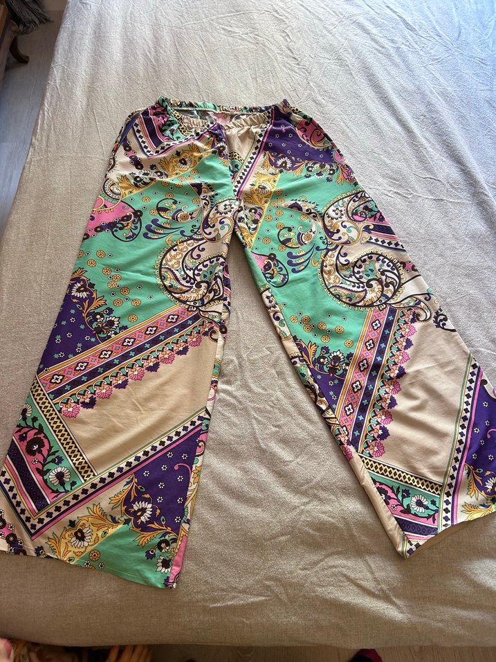 Uzun, bol kesim pantolonlar, pastel renkli desenli kumaş ve drapeli tasarımıyla bohem tarzını yansıtıyor. SALAŞ ALT