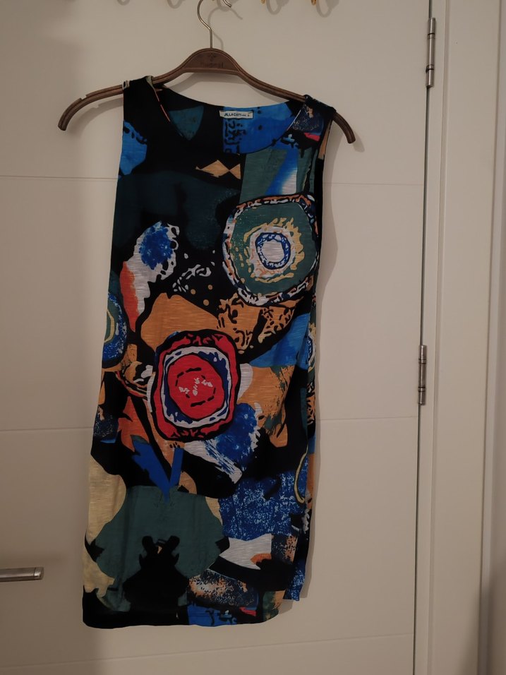 Kolsuz, uzun boy, vücuda oturan elbise Yuvarlak yaka ve drapeli detaylara sahip, çok renkli bohem desenli. Günlük kullanıma uygun.