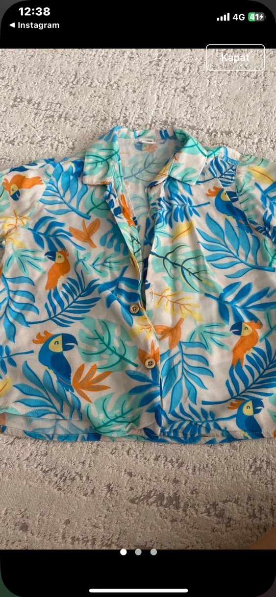 Bol kesim, kısa kollu, yakalı ve düğmeli gömlek. Pastel çok renkli tropikal desenli, yumuşak sentetik kumaştan, günlük kullanım için uygun.