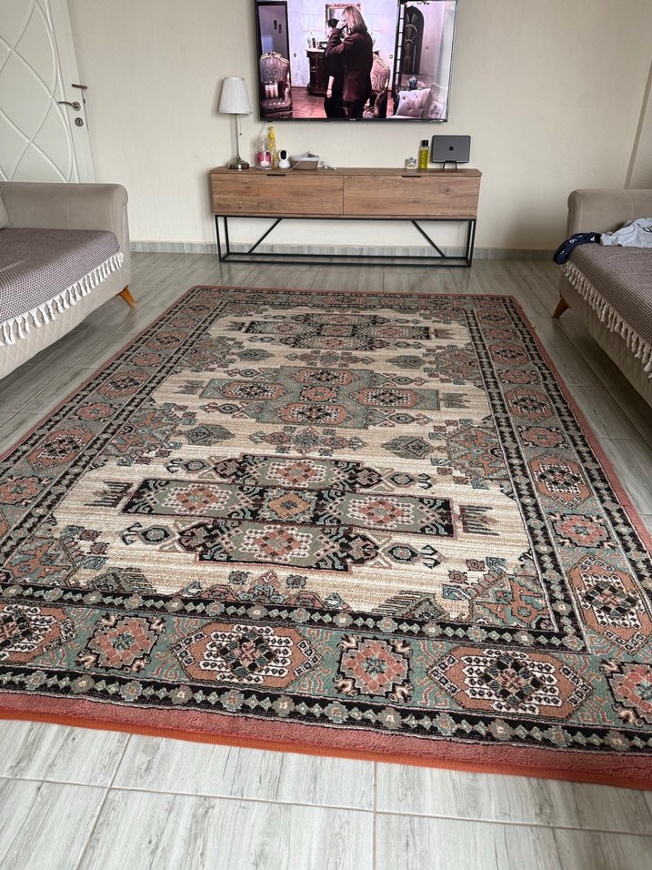 Koyu tonlu, çok renkli ve desenli bohem tarzı halı. Her odaya sıcak ve sanatsal bir dokunuş katar. 6m2 tertemiz daha yeni yıkandı
