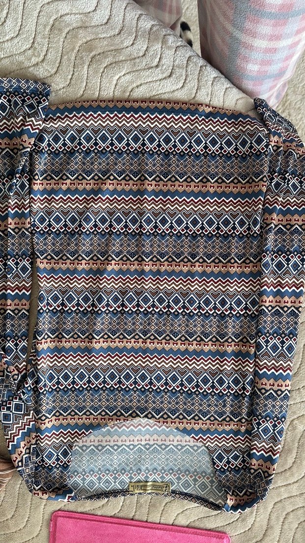 Bohem tarzda, çok renkli desenli ve örme dokulu hamile tunik. Uzun kollu, kayık yaka, bol kesim ve midi boyda, günlük kullanıma uygun.