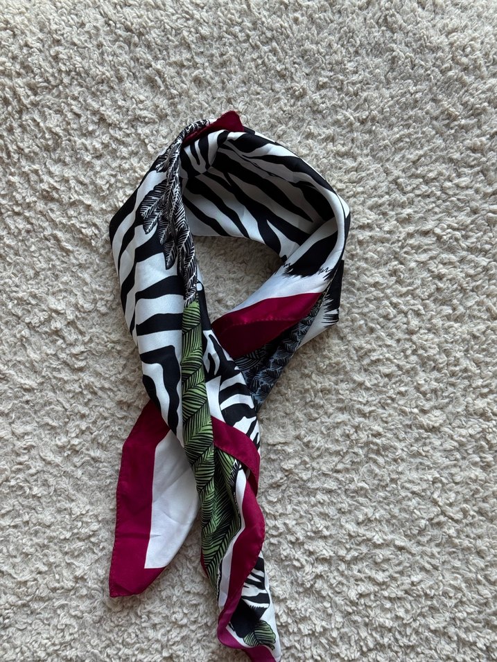 Kadınlar için çok renkli, koyu tonlarda zebra ve yaprak desenli, yumuşak sentetik kumaştan yapılmış bohem tarzda drapeli fular.