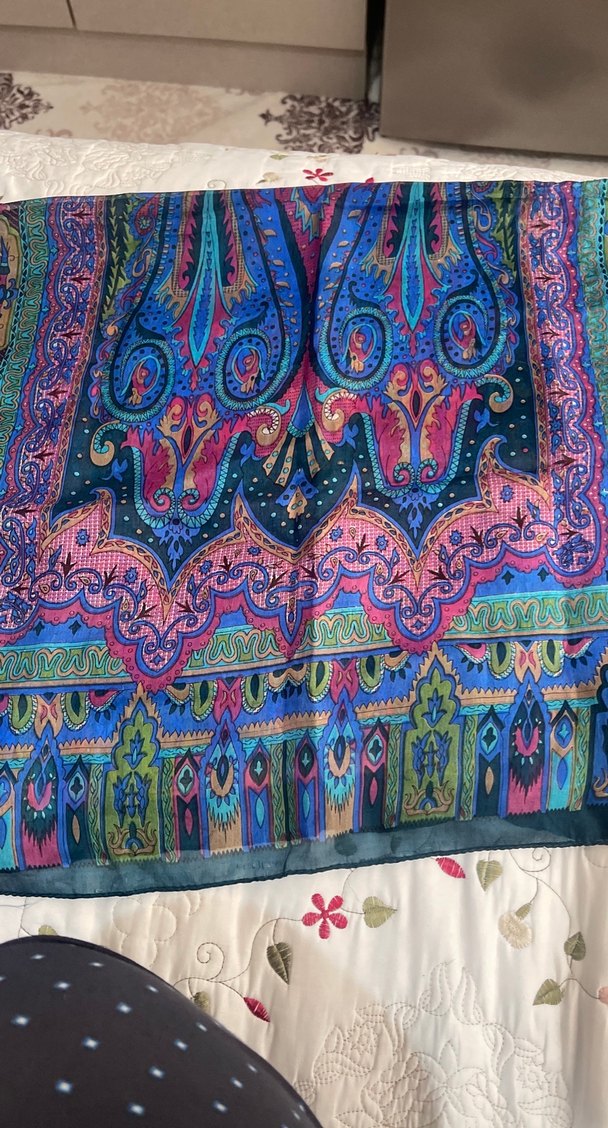 Kadın şalı, koyu renkli çok renkli tekstil ve detaylı bohem desenlere sahip, drapeli tasarımıyla hippie ve retro tarzını yansıtır. İpek kumaştır