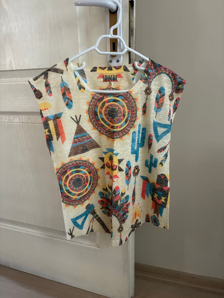 Bohem tarzı, kolsuz, bol kesim, çok renkli desenli, kısa boy, yuvarlak yakalı, örme dokulu bluz. Günlük kullanıma uygun. Marka temsilidir. Hiç kullanılmamış S beden #tişört En 45cm, boy 55 cm. #etnik #bohem