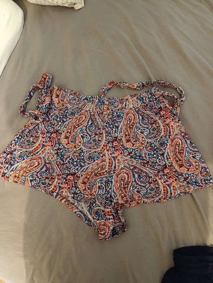 Gevşek kesim, çok renkli koyu paisley desenli bohem mini şort, drapeli tekstil kumaş, günlük ve denizde kullanım için uygundur.