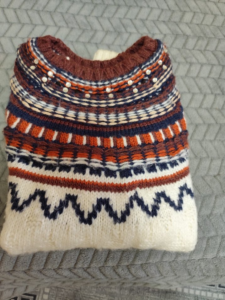Bohem tarzda, yuvarlak yakalı ve uzun kollu, bol kesim çok renkli desenli örgü kazak. Rahat ve günlük kullanım için uygundur.
