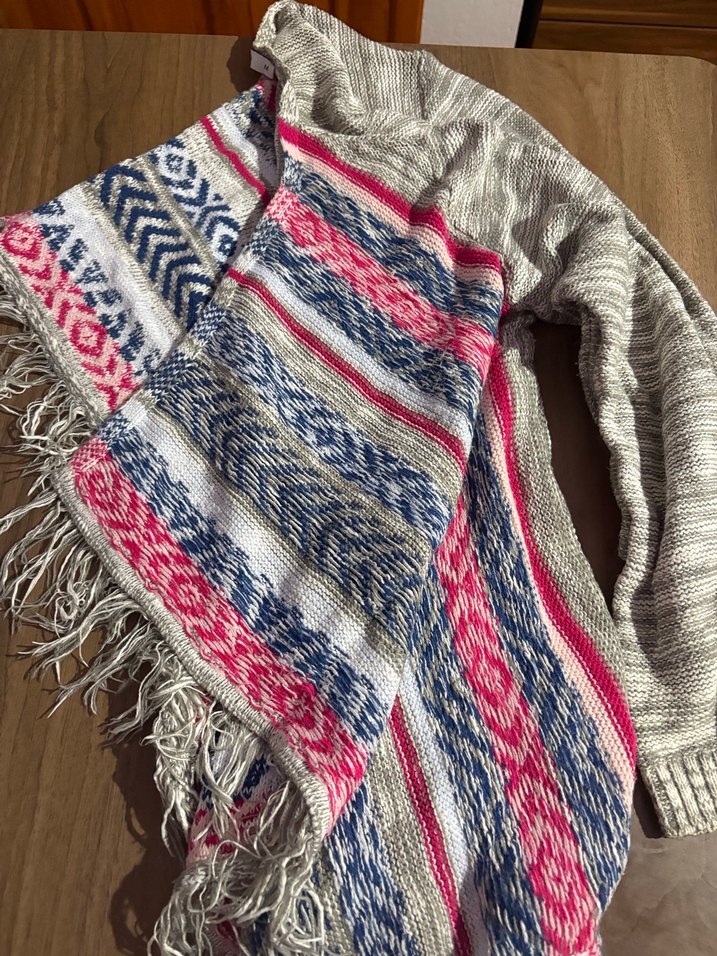 Yüksek yakalı, uzun kollu ve bol kesimli panço.Gri ve çok renkli desenli örgü kumaştan, püsküllü bohem tarzda.