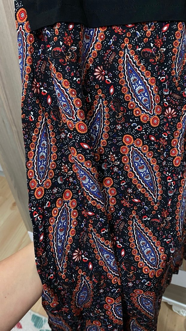 Yumuşak sentetik kumaştan, koyu çok renkli desenli, bohem esintili uzun ve salaş kesim pantolon. Günlük kullanıma uygun drapeli tarz.