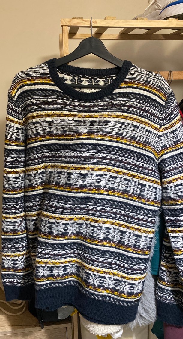 Bohem tarzı, çok renkli desenli, uzun kollu ve bisiklet yakalı örme kazak. Rahat ve bol kesim, günlük kullanıma uygun.