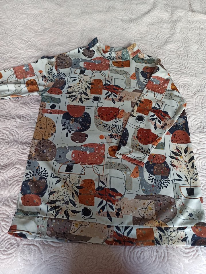 Bohem tarzda, çok renkli desenli tunik. Uzun kollu, balıkçı yaka ve kısa boyda, yumuşak kumaştan, rahat günlük kullanım için uygundur.