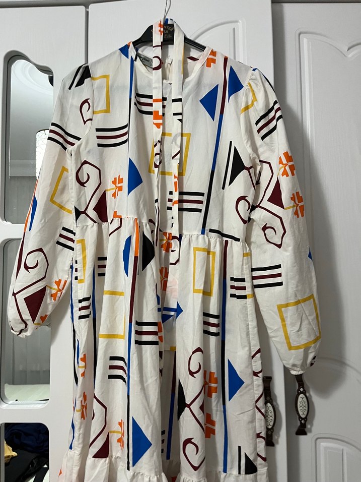 Bohem tarzda çok renkli geometrik desenlere sahip, düğmeli, V yaka, uzun kollu, bol kesim uzun elbise. Yumuşak dokulu kumaştan yapılmıştır, günlük kullanıma uygundur. Tatil için çok güzel kombin yapılır