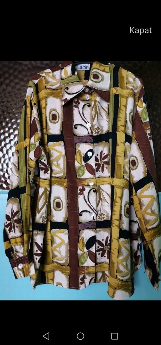 Bohem tarzda, düğmeli, uzun kollu, bol kesim ve çok renkli desenli tekstil gömlek, günlük kullanıma uygun.