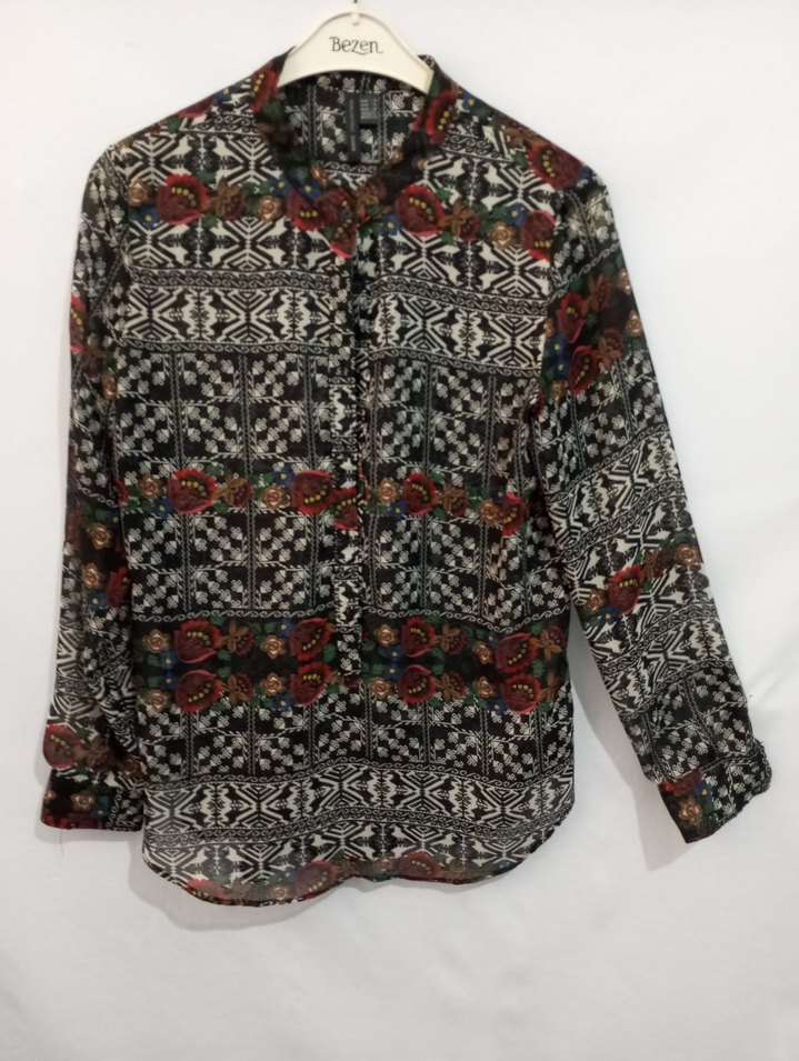 Bohem tarzı yüksek yakalı, düğmeli ve uzun kollu gömlek. Yumuşak dokulu kumaştan, bol kesim ve koyu çok renkli desenli, günlük kullanıma uygun. desenli tül kumaştan.
