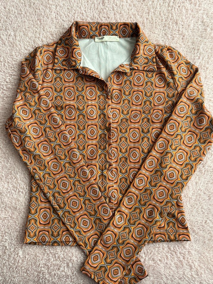 Bohem tarzda, çok renkli geometrik desenli, düğmeli ve uzun kollu, yakalı, vücuda oturan gömlek. Bir kez giyildi, çok iyi durumda.