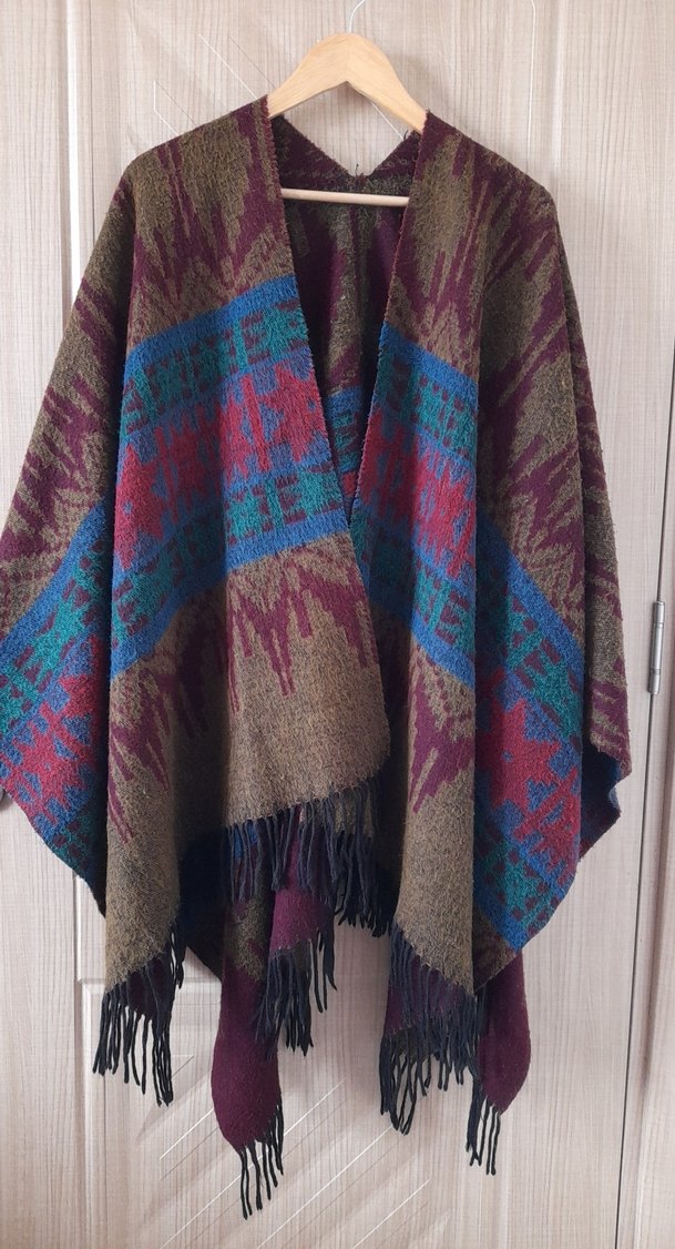 Bohem tarzda, çok renkli desenli, uzun ve bol kesim ponço. Dokuma kumaştan, uçları püsküllü, askısız ve dökümlü yapıda, günlük kullanım için uygundur.