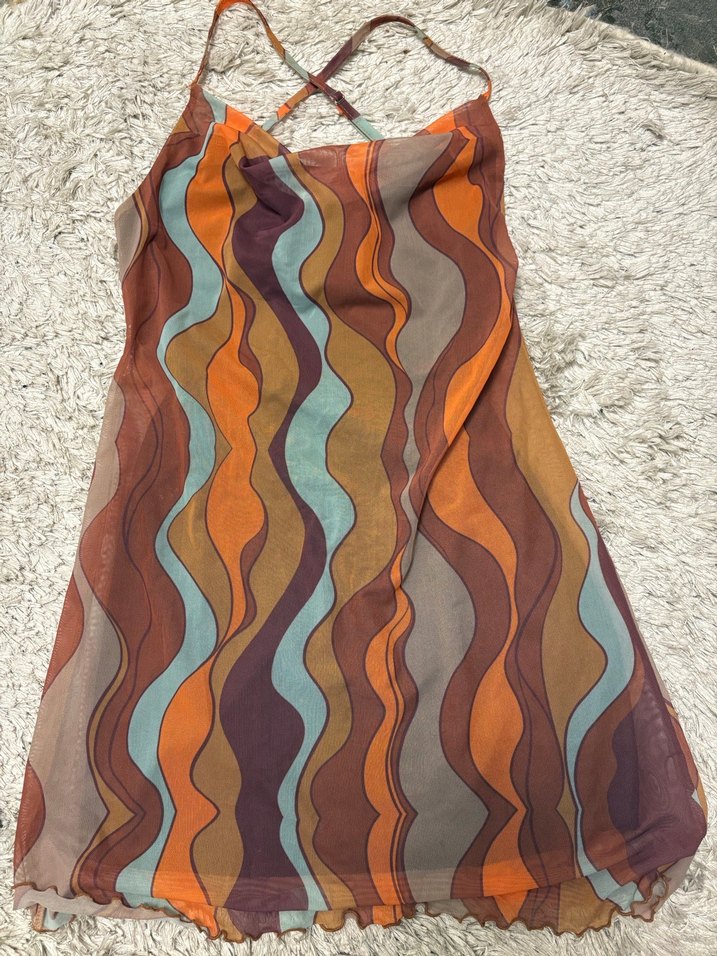 Kadınlar için pastel çok renkli dalgalı desenli, drapeli tasarıma sahip, yumuşak sentetik kumaştan bohem tarzda elbise.