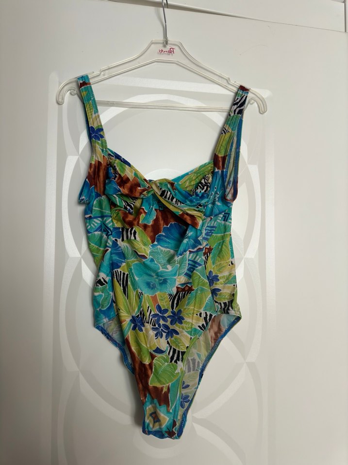 Bu vücuda oturan bohem mayo, askılı ve drapeli tasarımıyla pastel tonlarda çok renkli batik desenlidir.