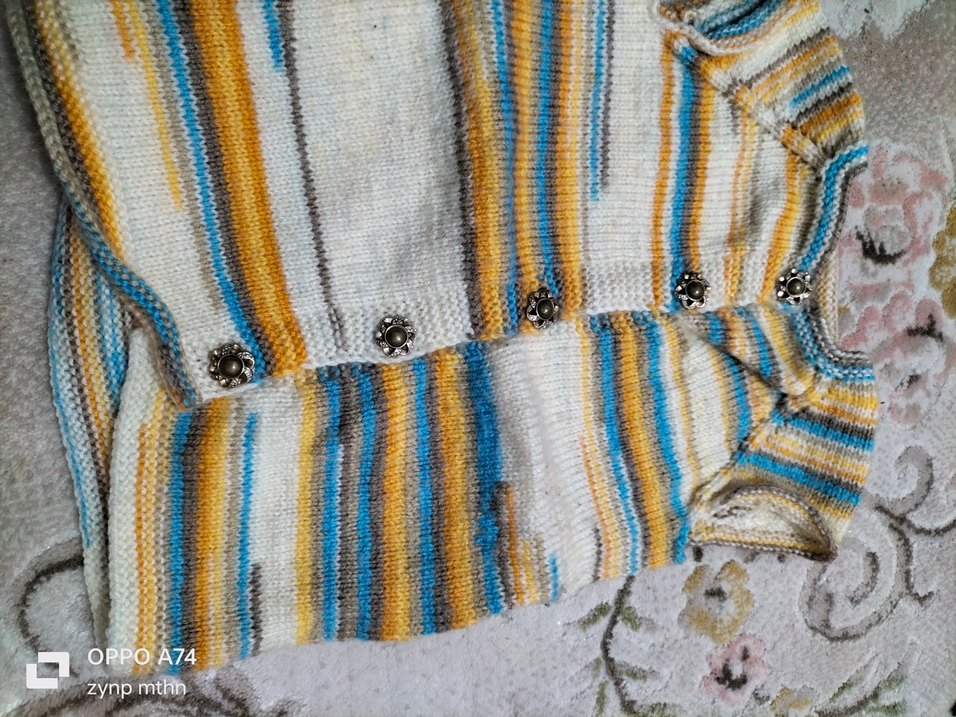 Uzun kollu, düğmeli ve bol kesim hamile hırkası, çok renkli batik desenli ve rahat dokulu kumaştan üretilmiştir.