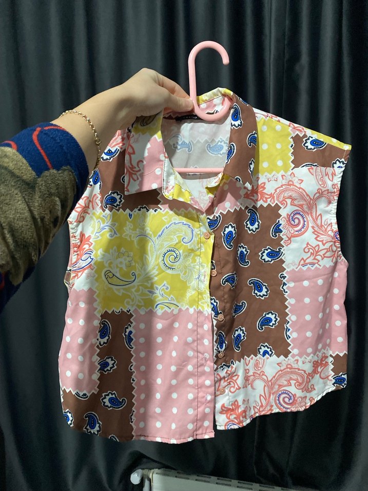 Kolsuz, düğmeli ve yakalı bu gömlek bol kesimdir. Pastel çok renkli tie-dye ve patchwork desenlidir, bohem tarz için uygundur. 1 kere kullanıldı sorunsuz