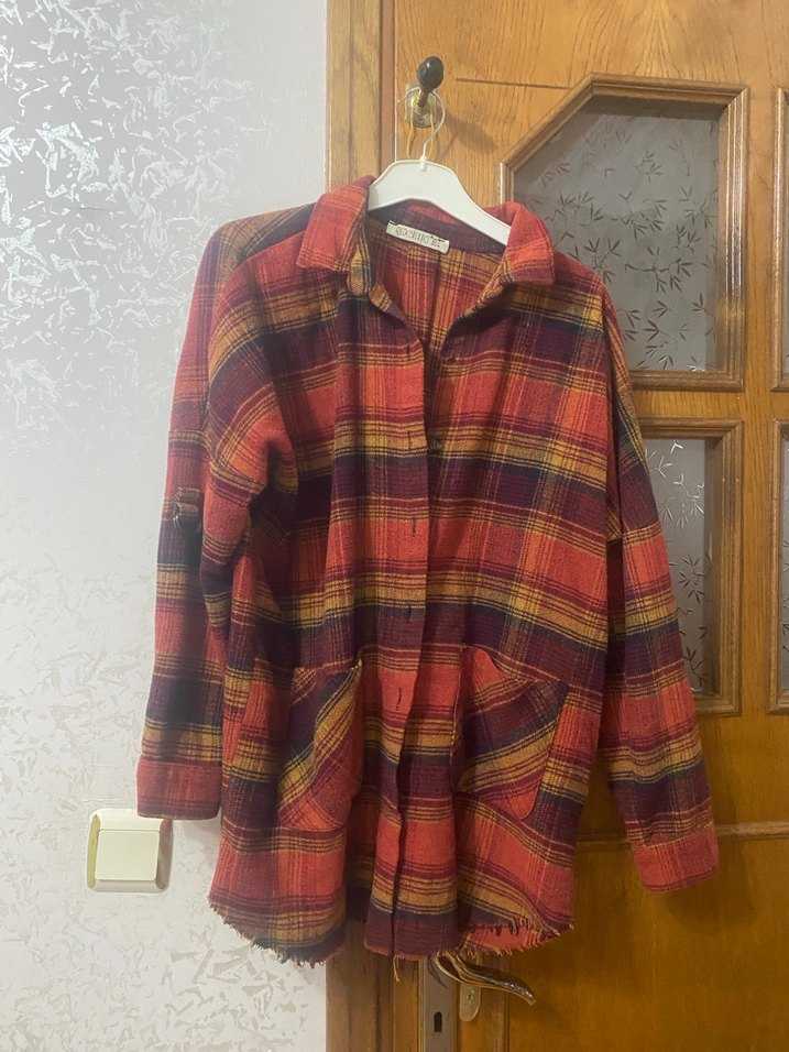 Bol kesim, uzun kollu, düğmeli ve yakalı gömlek. Koyu çok renkli batik desenli, ön cepli tekstil kumaştan.