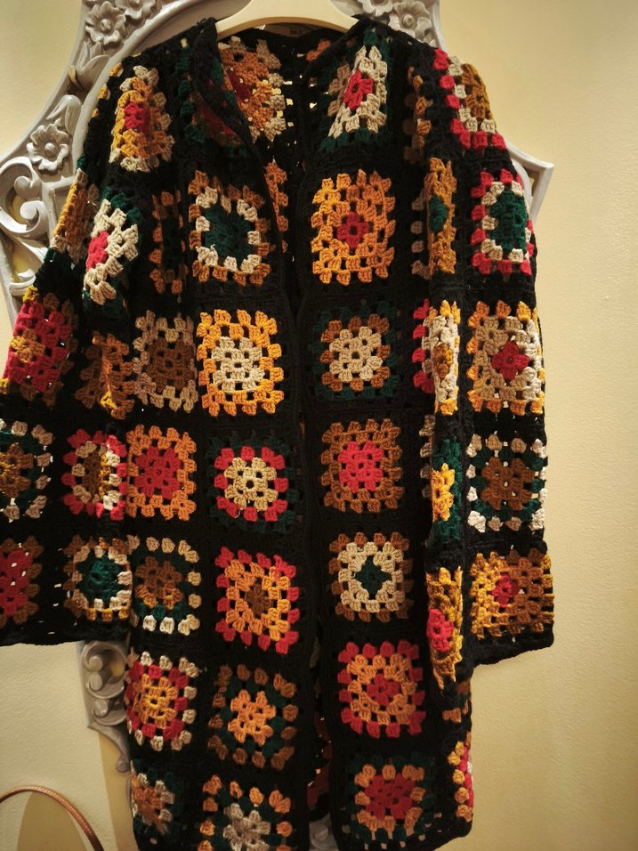 Uzun, bol kesim kadın hırka, çok renkli desenli el örgüsüdür. Uzun kollu ve yakası kesik detaylı, rahat bohem tarzına uygundur. 1 kel kullanildi
