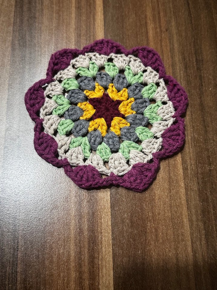 Bohem tarzda çok renkli, el yapımı motif. Mor, yeşil, gri, sarı ve bej tonlarında, çiçek şeklinde dokuma deseni içerir.