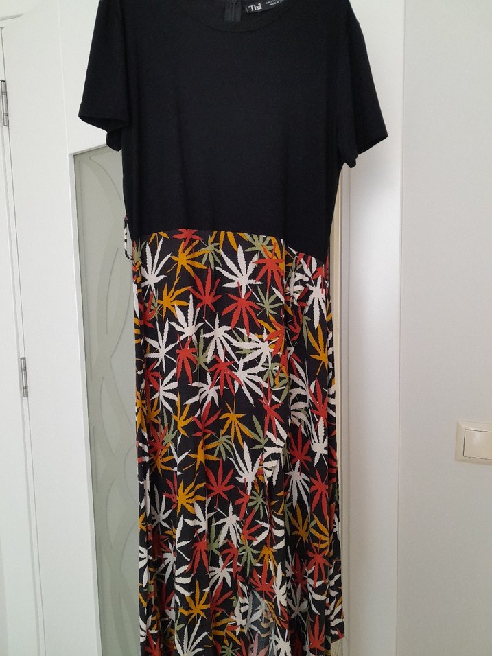 Uzun, kısa kollu elbise. Alt kısmında çok renkli tie-dye desen ve drapeli tasarım bulunur. Bohem tarzda, günlük kullanıma uygundur. s ve m bedenlere uygun. 2 kere kullanıldı