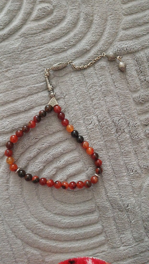 Bohem tarzı, koyu çok renkli yuvarlak boncuklardan oluşan erkek tesbihi, gümüş renkli püskül ve zincir detayıyla.