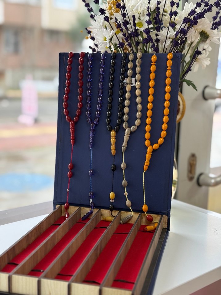 Bohem tarzda, koyu ve çok renkli erkek tesbih seti. Her biri şık bir kutuda sunulmaktadır.