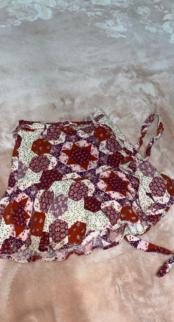 Bohem tarzda, çok renkli koyu tonlarda bağlama desenli, fırfırlı ve rahat kesim midi etek. Günlük kullanıma uygundur.