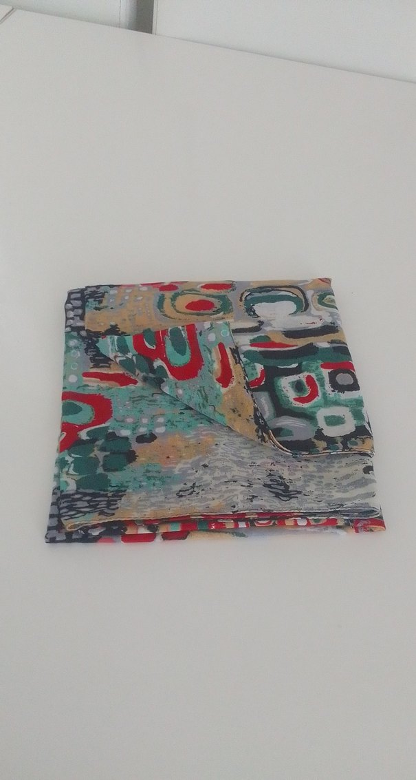 Kadınlar için çok renkli tekstil fular, fırfırlı kenarlarıyla bohem ve retro tarzını yansıtıyor. Gri tonlarında canlı, soyut desenlere sahip.