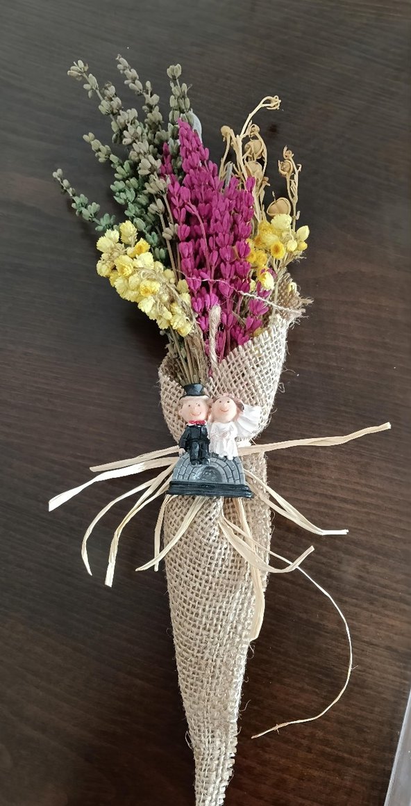 Bohem tarzda, çok renkli kuru çiçeklerden oluşan, doğal kumaşla sarılı, püskül detaylı ve küçük gelin-damat figürlü düğün aksesuarı.