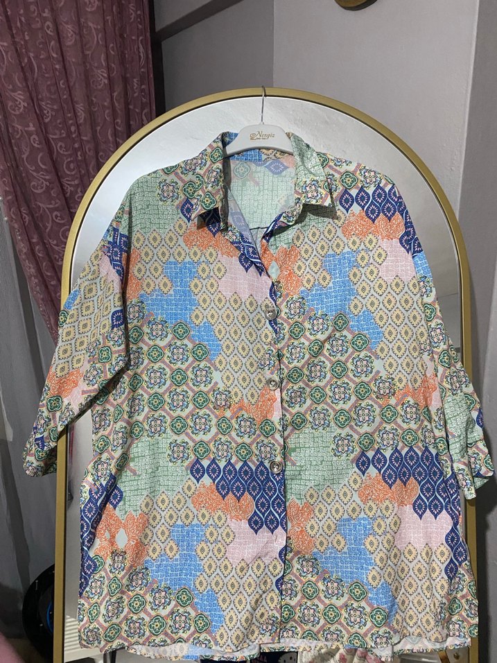 Bohem tarzı, çok renkli, düğmeli, kısa kollu, yakalı, bol kesim gömlek. Yumuşak dokulu tekstil kumaştan üretilmiştir.
