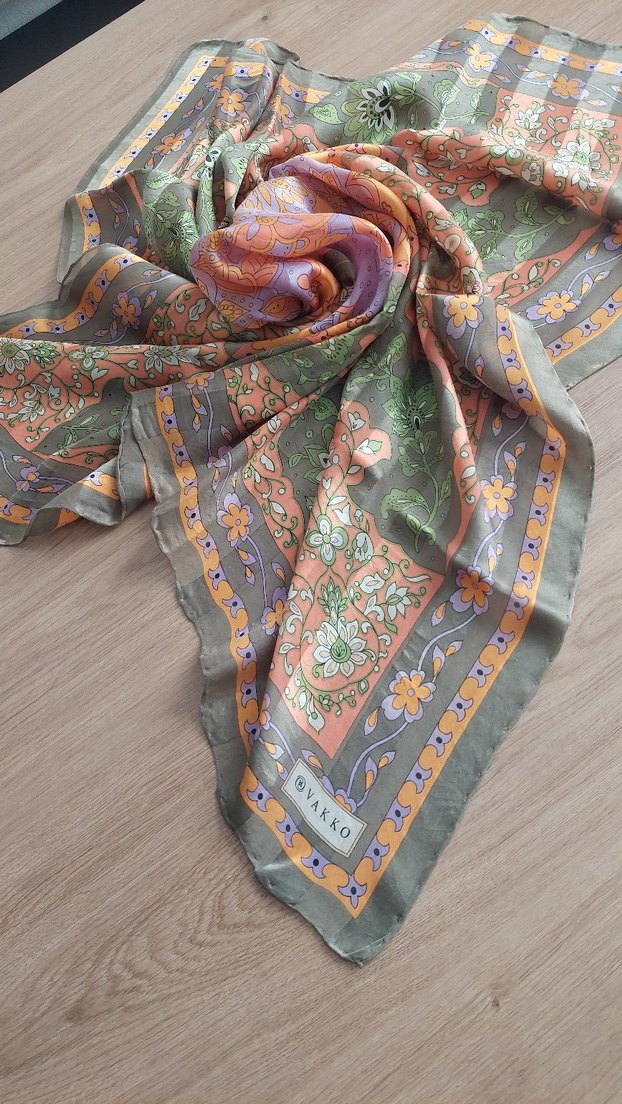 İpek dokulu, bohem tarzda, çok renkli çiçek desenli ve gri tabanlı, drapeli şal. vakko esarp yut dışından almıştım tertemiz bir ürün