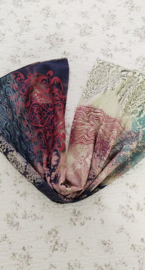 Kadınlar için çok renkli, ipek dokulu, bohem tarzda ve drapeli şal. Koyu tonlarıyla retro ve hippie ruhunu yansıtıyor.