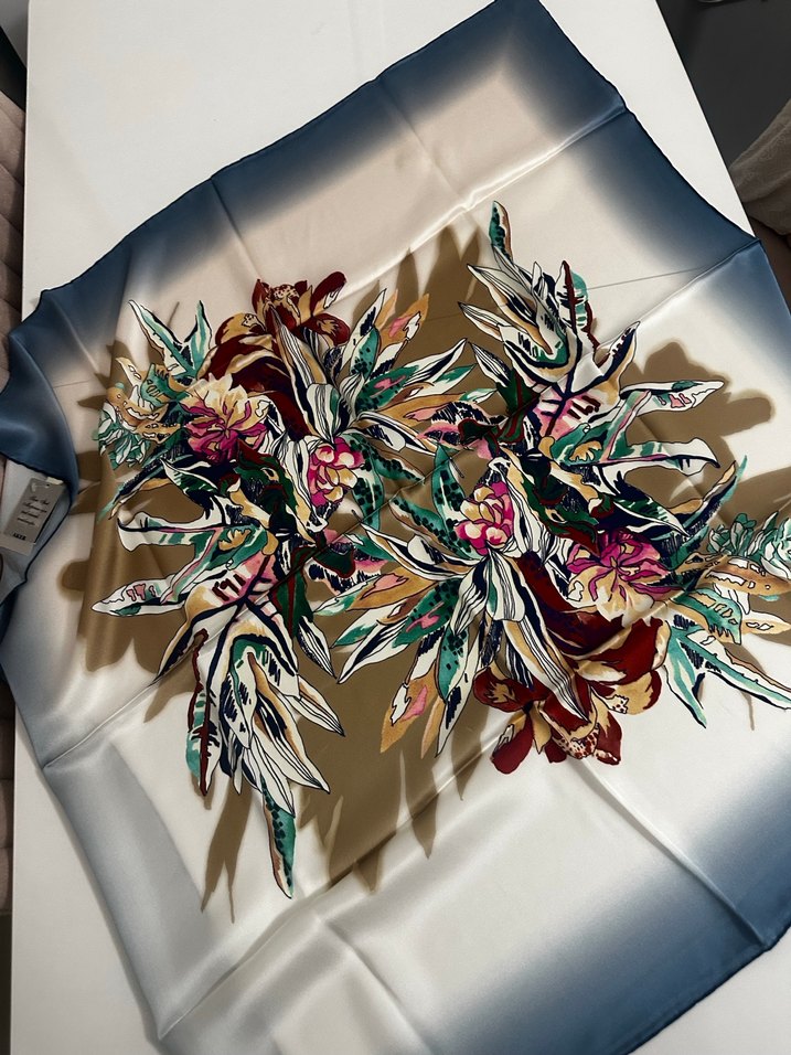 Kadınlar için çok renkli çiçek desenli, ipek kumaştan bohem tarzda drapeli eşarp. Hiç kullanılmamıştır etiketlidir fakat en sonki resimde göründüğü gibi ufak bi su lekesi mevcuttur yıkanınca muhtemelen çıkacaktır