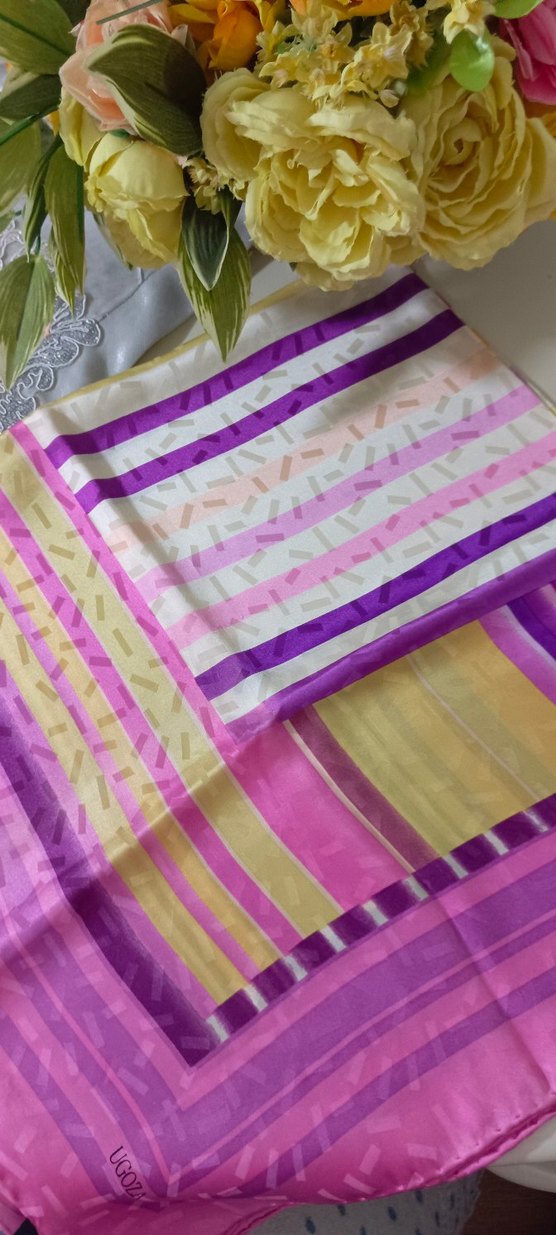 Bohem tarzda, çok renkli pastel çizgili, ipek dokulu ve drapeli kadın eşarbı.Yumuşak ve dökümlü dokusuyla fular olarakta kullanılır.Retro tarzına uygun.Hiç kullanılmadı.Görünenden daha açık renk.Küçük bir yerinde belirsiz güneş alması var.Son görselde,fiyata yansıtıldı.Sura ipektir.