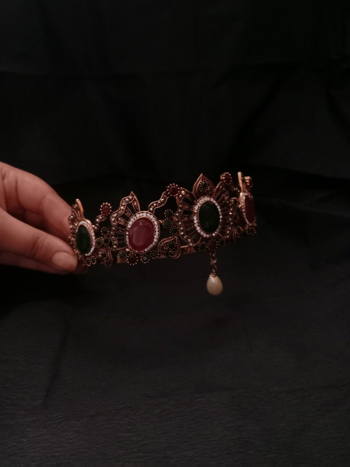 Bohem tarzda, çok renkli boncuklar ve işlemeli desenlere sahip koyu renkli taç düğün ve retro görünümler için uygun.