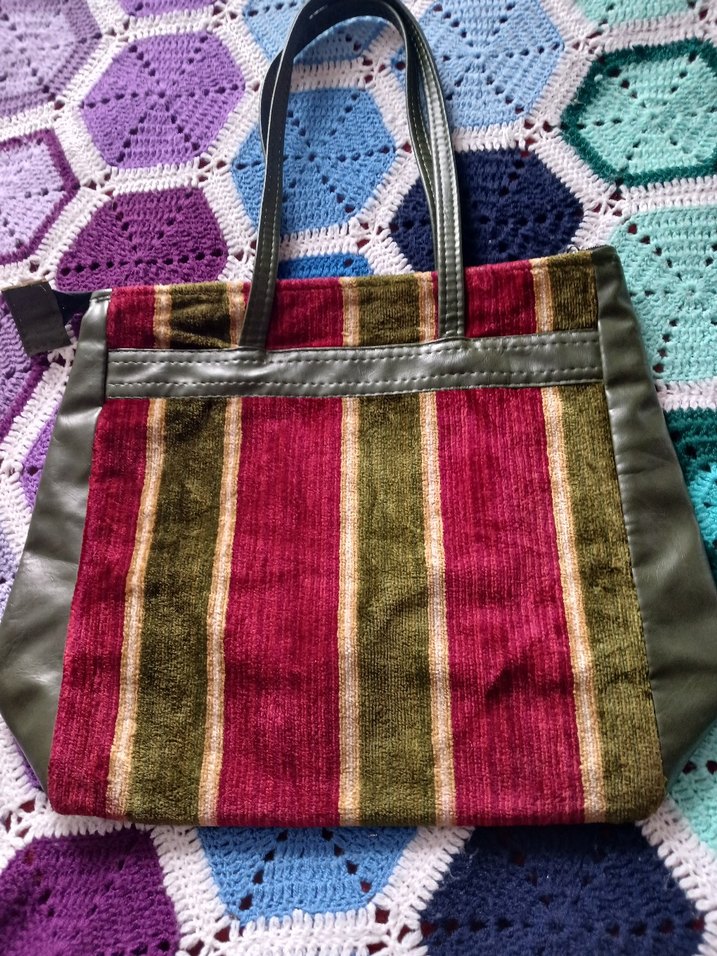 Bohem tarzda, çok renkli dikey çizgili tekstil kadın çanta. Yeşil deri saplar ve fermuarlı kapanışa sahip. Günlük kullanıma uygun, retro ve hippie havasında.