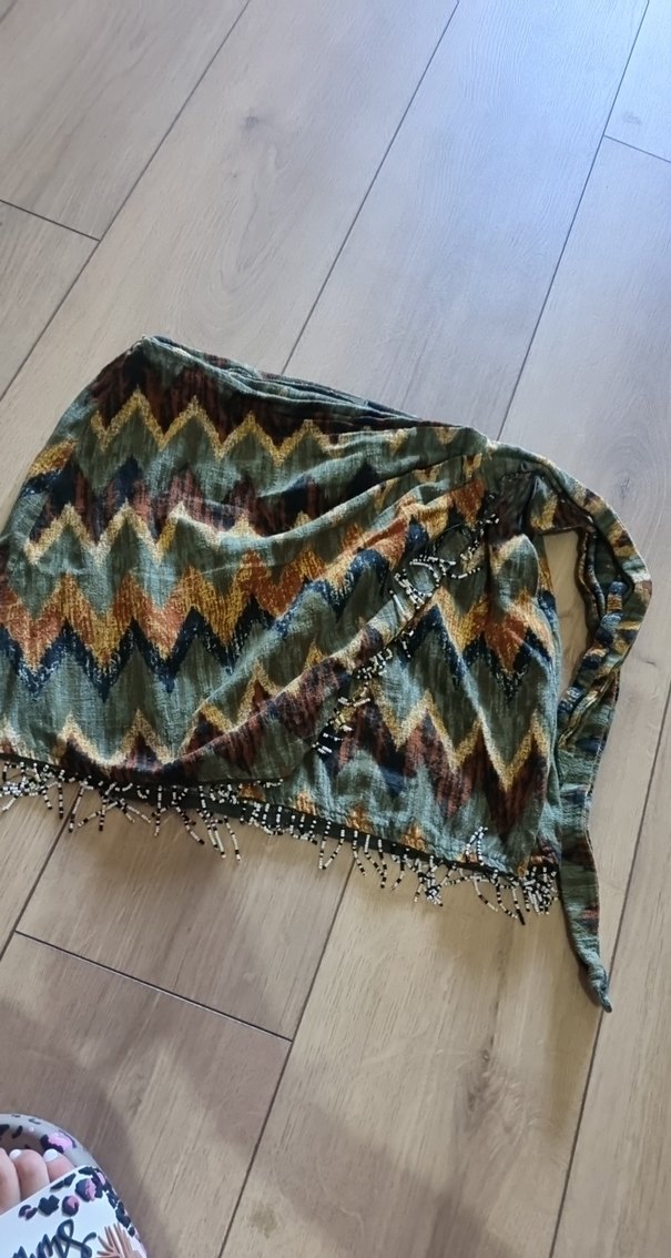 Koyu tonlarda çok renkli zigzag desenli, dokulu kumaş ve süslü püsküllerle bohem tarzda kadın drapeli şal.