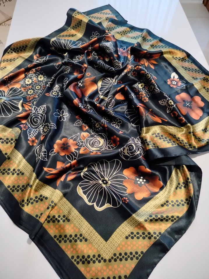 Bohem tarzda, çok renkli çiçek desenli, sentetik kumaştan kadın eşarp. Drapeli kesimiyle retro ve hippie stiline uygundur.