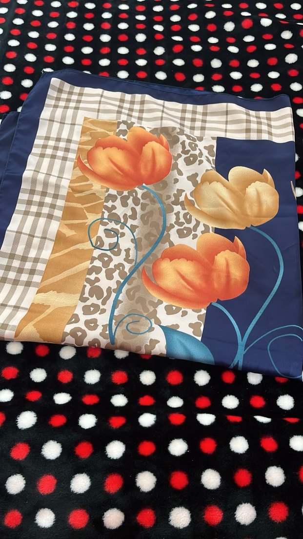Bohem tarzda, çok renkli çiçek ve desenli, pilili sentetik kumaştan kadın fular, rahat ve retro bir görünüm sunar.