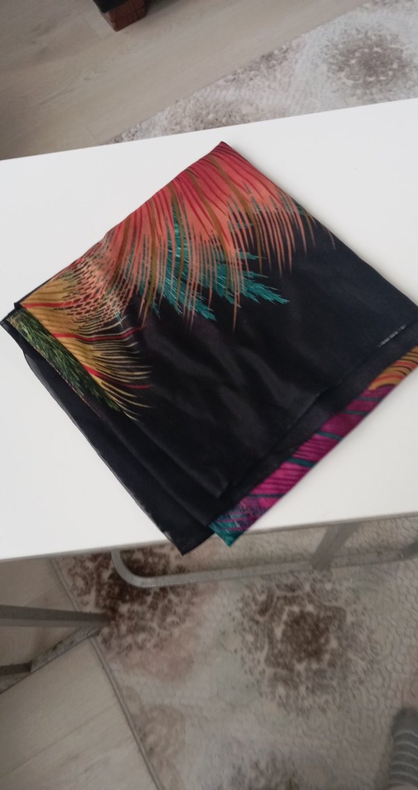Kadınlar için bohem tarzda, çok renkli ve koyu tonlarda, dökümlü tasarıma sahip sentetik kumaştan fular. Retro ve hippie detaylar içerir.