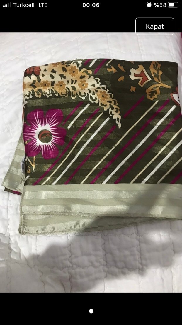 Bohem tarzda, çok renkli desenli, sentetik kumaştan drapeli kadın fular.