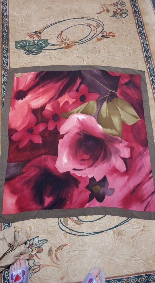 Kadın eşarp, çok renkli koyu tonlu çiçek desenli tasarıma sahip ve ipekten yapılmıştır.